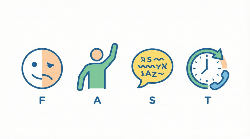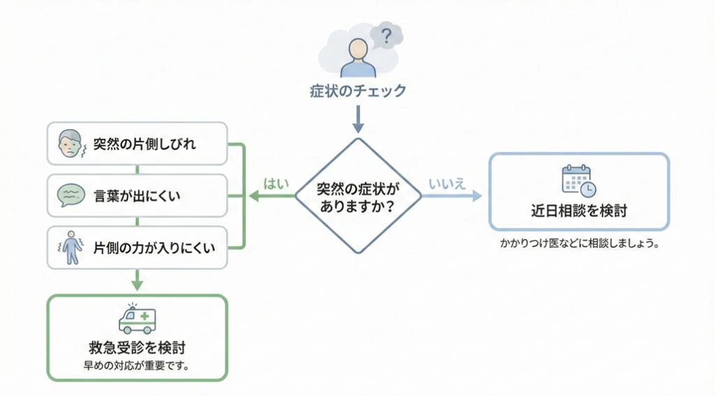脳卒中(脳梗塞・脳出血など)は突然症状が出ることが多く、典型的には「顔・腕・言葉」の異常が手がかりになります。