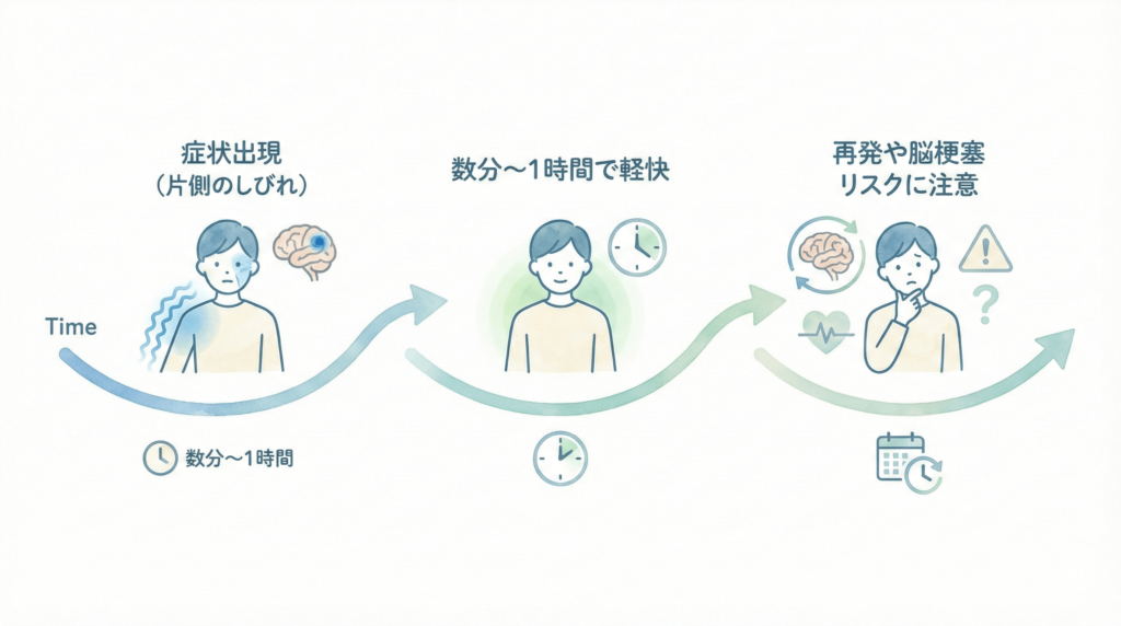 TIAは短時間で症状が消えることがあり、画像で明らかな梗塞がない場合もあります。ただ、TIA後は早期に脳梗塞が起こるリスクが示されているため、症状が消えても受診の検討が大切です。